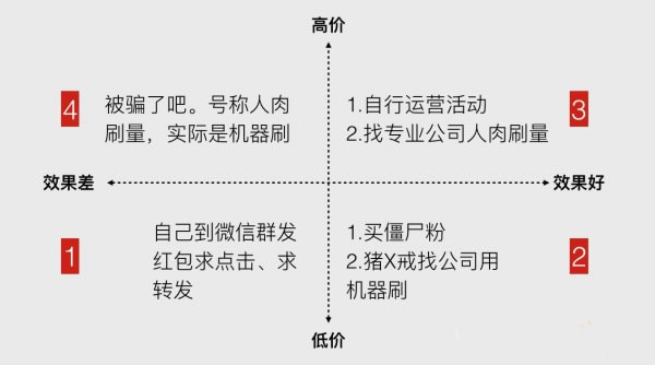 第一象限:最low的刷量方法,自己刷,在群里发红包,求转发,求阅读,求点赞。这个成本很高,性价比很低,关键是你上不了规模啊。在一百个群发,估计能来个3000阅读很牛逼了,但这个是非常消耗自己人品的,哪一天就像三节课的群一样,一看到发广告就被晓玲同学给踢了,得不偿失。